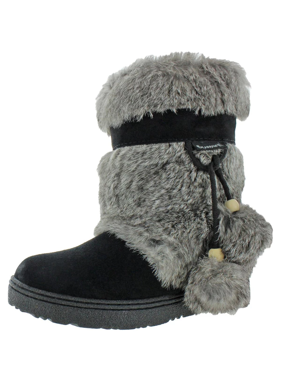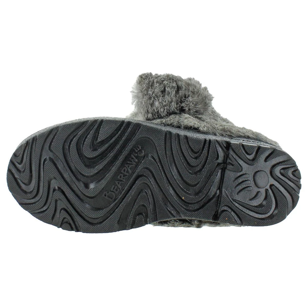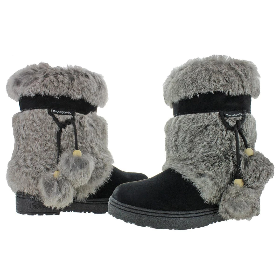The Tama boot is a water shedding boot by Bearpaw. This shoe features cow suede uppers with rabbit fur trim. It has a wool blend lining with a sheepskin footbed for warmth. It also features a rubber with cork cupsole and 9″ tall shaft.